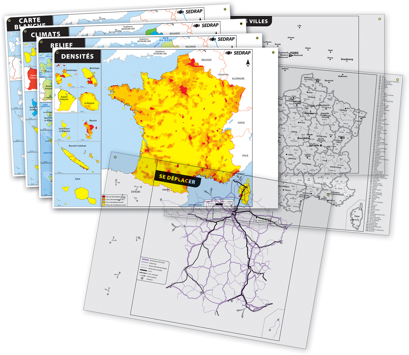 Les lots de cartes permettent de mettre en avant les principales caractéristiques de la géographie, en France, dans les DROM-COM, dans le cadre européen.